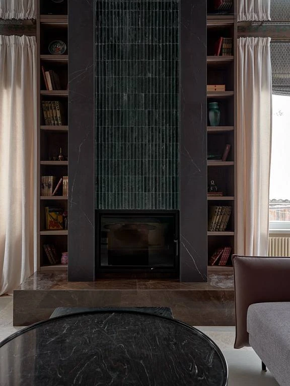 - Центром притяжения гостиной стал камин. Его оформили эффектным черным керамогранитом Нолана 80х160. Глубокий цвет и выразительная поверхность подчеркивают геометрию каминной зоны и добавляют интерьеру характер.