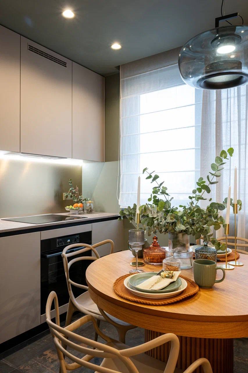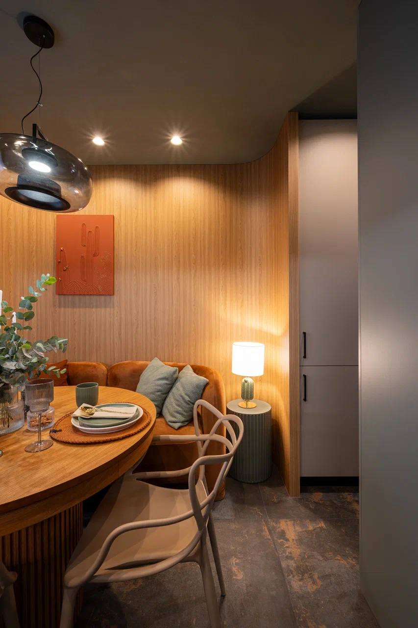 Керамогранит Патина становится ключевым элементом интерьера, где тёплое дерево, округлая мебель и мягкий свет создают уютный фон.