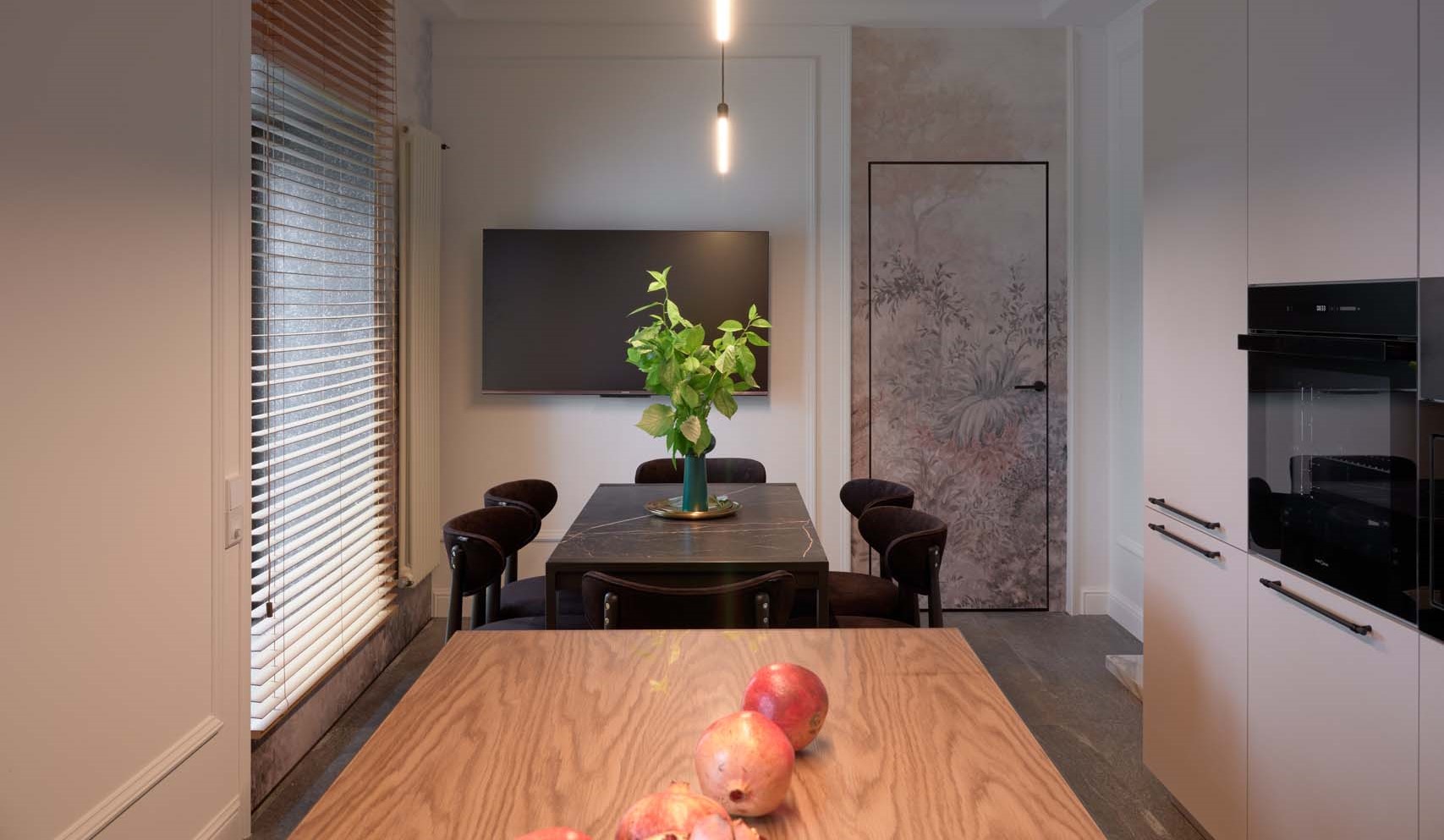 • Пол кухни выполнен из керамогранита Трамонтана, оттенок 02. Этот материал идеально имитирует роскошную текстуру кварцита и придает помещению особую атмосферу, сочетая практичность и эстетику.