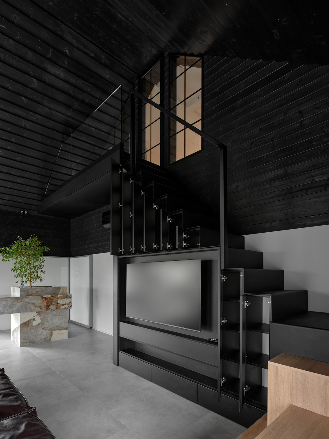 На телевидении вышел новый проект, в котором керамогранит Граффито TM Estima стал ключевой частью интерьерной концепции. Автор пространства, Алексей Аладашвили, создал выразительную архитектурную композицию, основанную на контрасте чёрного потолка, графичных мебельных объёмов и насыщенных красных акцентов.